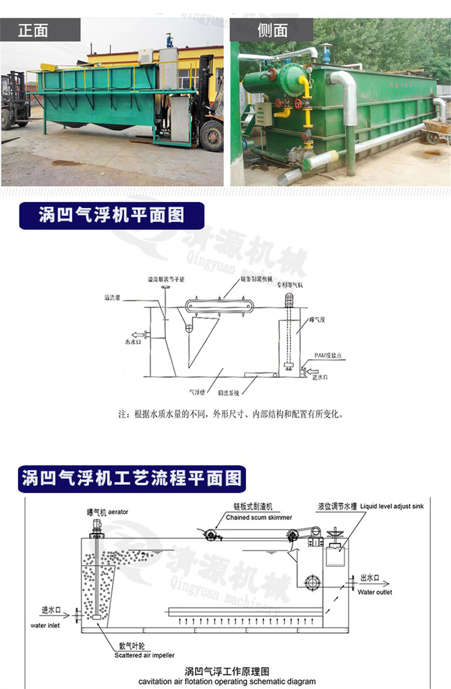 未经处理的污水首先的进入曝气区,与微气泡充分混合,微气泡在上升的过程中将固体悬浮物带到水面,刮泥机沿液面运行将悬浮物刮到倾斜的金属板上,再将其推入污泥排放管槽,通过污泥排放管槽流入污泥收集器,刮泥机动力只有0.5KW。污水净化后在排放前会经过斜板下方的溢流槽,溢流槽用来控制气浮槽的水位,确保槽中的液体不会流入污泥排放管道,开放的咽流管道从曝气段沿着气浮槽的底部伸展。在产生微气泡的同时,涡凹气浮机会在有回流管的池底形成一个负压区,这种负压作用会使废水从池子的底部回流到曝气区,然后又返回气浮段。这个过程 确保没有进流量的情况下,气浮仍不断进行。本设备的处理量为5-500m/每小时,处理费用为0.3元/吨废水左右。