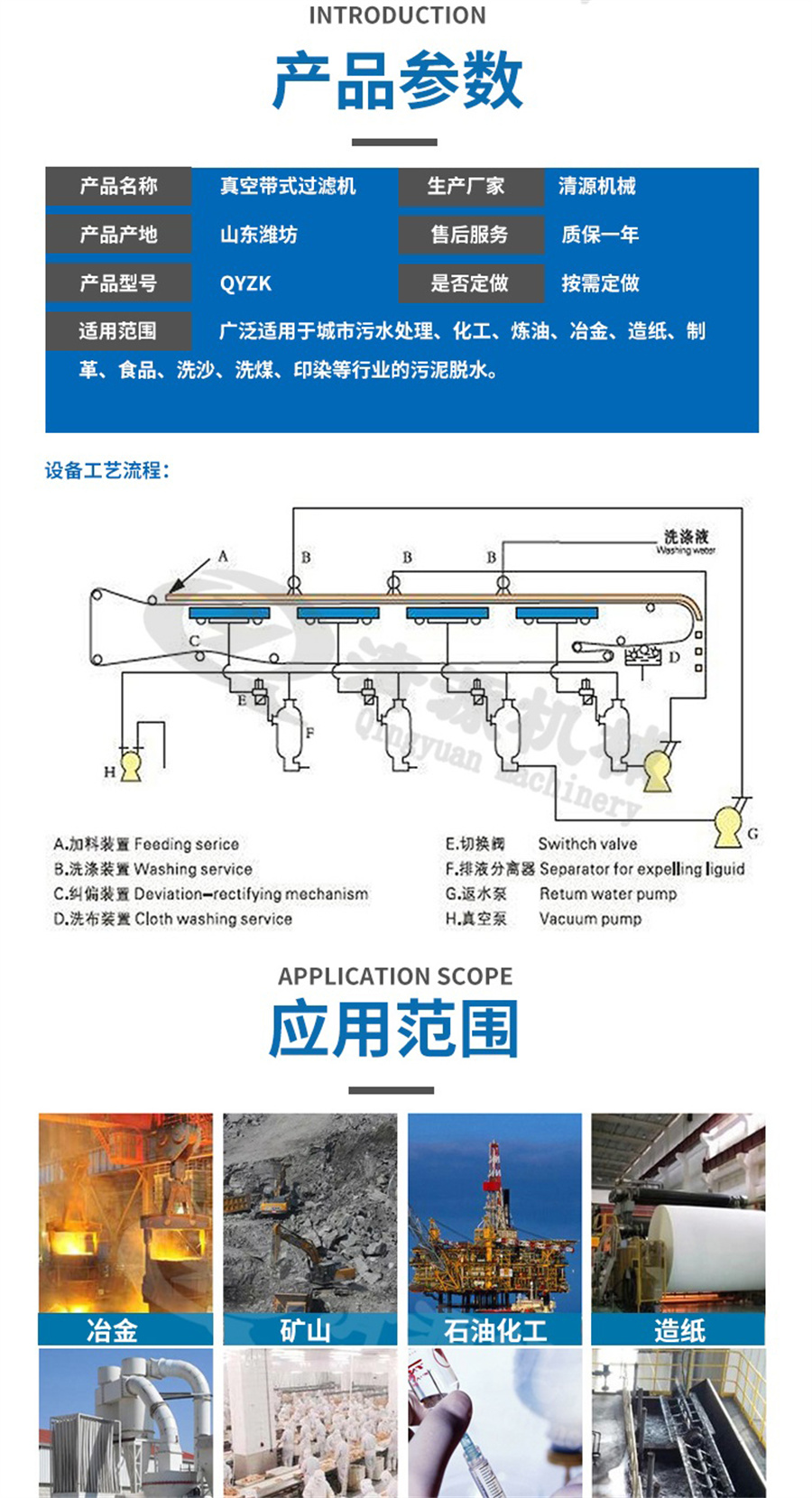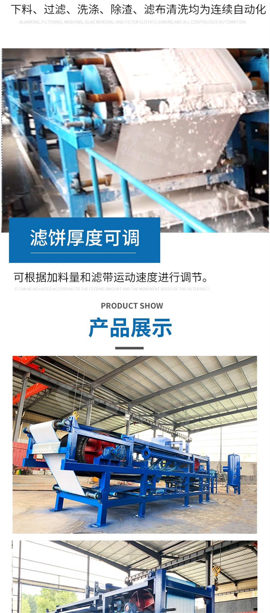真空带式过滤机是一种自动化程度高的新型过滤设备,该机以过滤布或滤网为介质,使料浆水平布置于过滤介质之上,充分利用料浆重力和真空吸水实现固液分离。连续水平带式真空过滤机可适用于多种浓度条件下的物料,过滤效率高,因而被众多工业界优先采用。