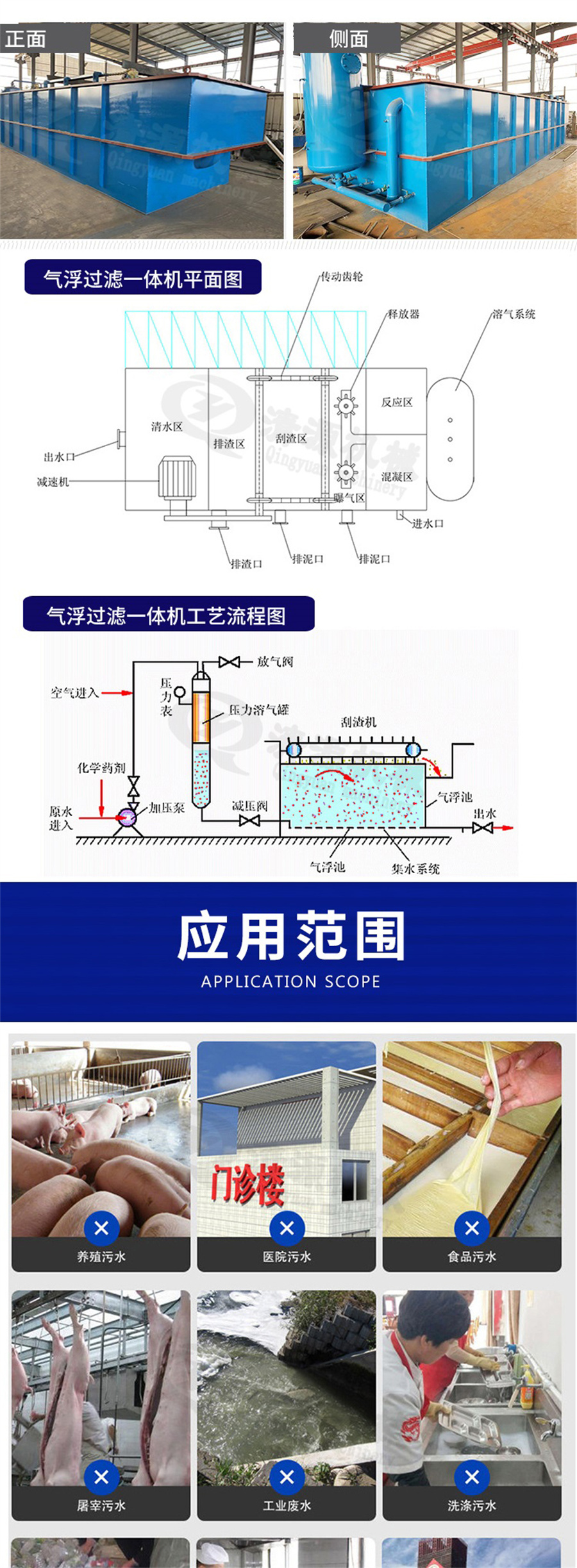 气浮过滤一体机主要适用于处理废水经反应后絮体比重接近于水的各类废水,气浮过滤一体机广泛应用于机械、化工、轻纺、交通、食品等行业,特别适用于油田钻井污水、油田回注水、炼油厂污水的处理。本机主要处理工艺采用物理化学法。将化学法、气浮法、过滤吸附法等传统成熟工艺经过有机组合设计而成。具有工艺简单合理、适应性广、结构紧凑、运输安装方便、操作简便、性能稳定可靠的特点。对油水分离,悬浮物、COD、BOD的去除有很好的效果,一般废水经处理后都能达到排放标准。