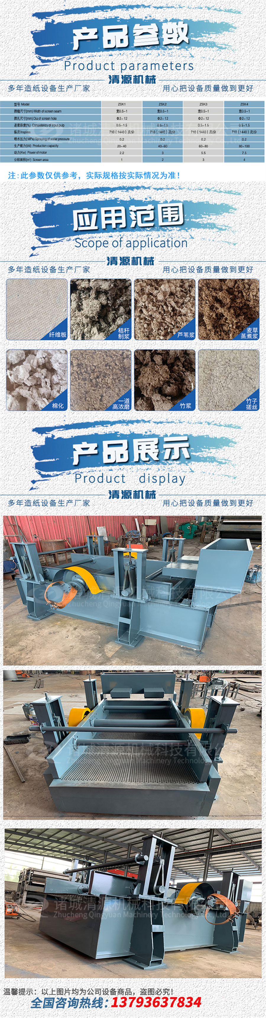 振框平筛浆料自进浆箱流入筛框,通过筛框的高频振动来筛除浆中粗大杂质。良浆通过筛板进入浆槽,由出浆口排出,粗大杂质则由筛框的端部排出。