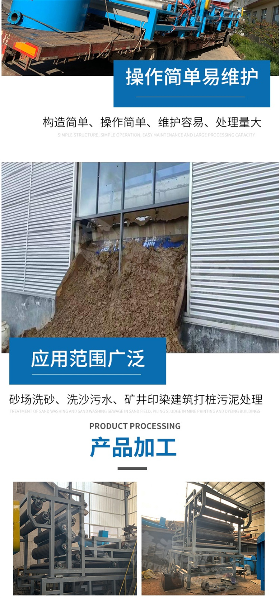 带式压滤机广泛应用于城市生活污水、纺织印染、电镀、造纸、皮革、酿造、食品加工、洗煤、石油化工、化学、冶金、制药、陶瓷等行业的污泥脱水处理,也适用于工业生产的固分离或液体浸出工序。
