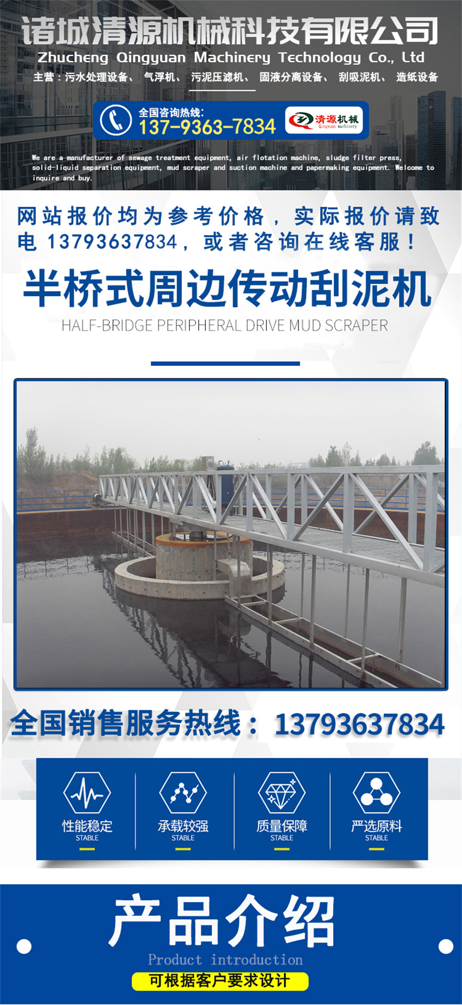半桥式周边传动刮泥机用于污水处理厂圆形沉淀池,将沉淀在池底上的污泥刮集至积泥坑,以便污泥回流和浓缩脱水;并将吃面浮渣撇向集渣斗,通过浮渣漏斗排出池外,以便进一步处理。