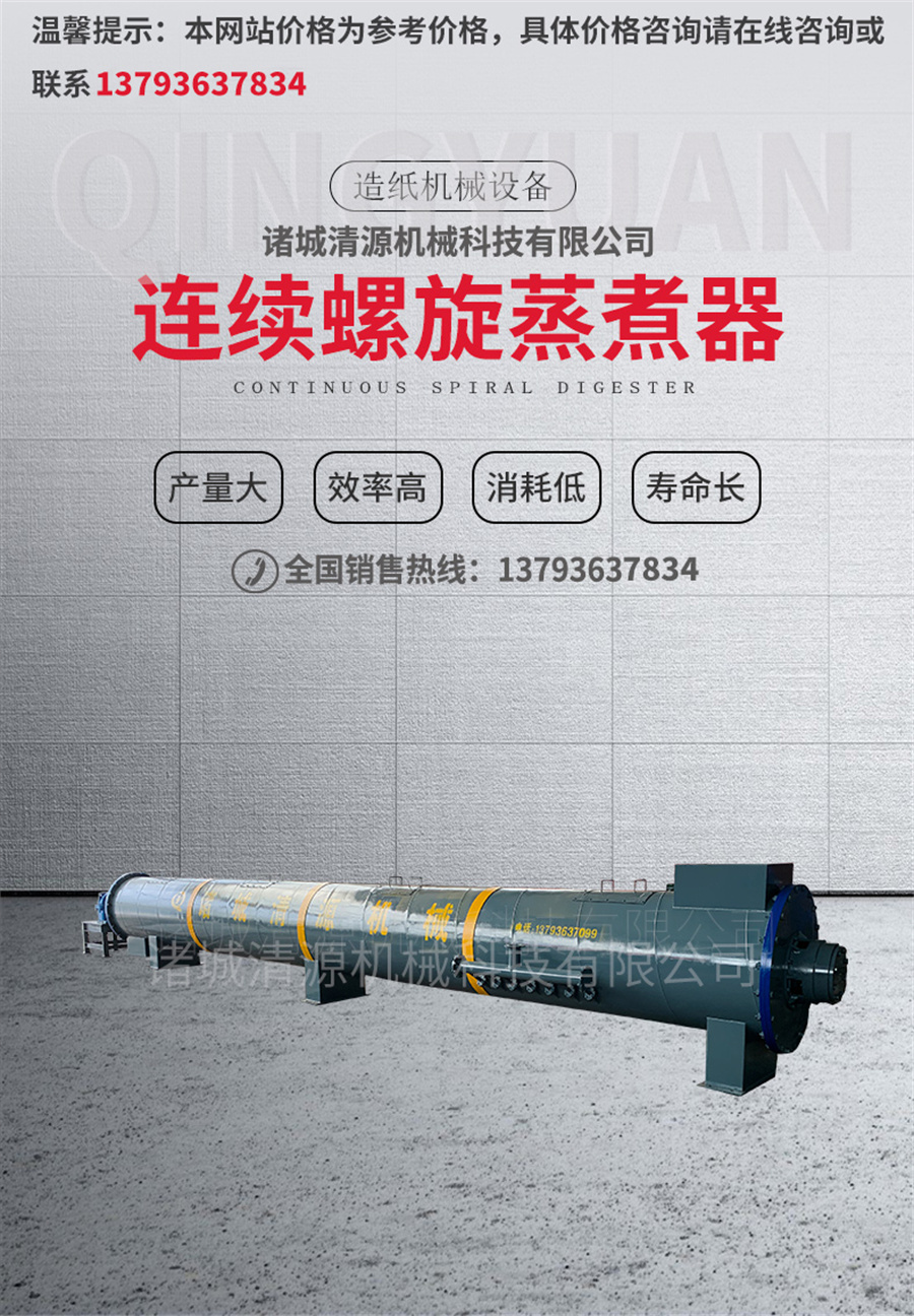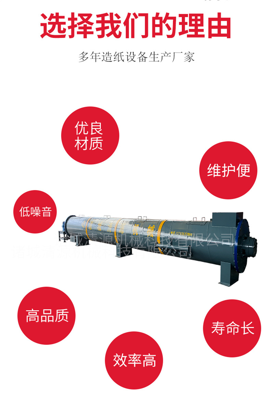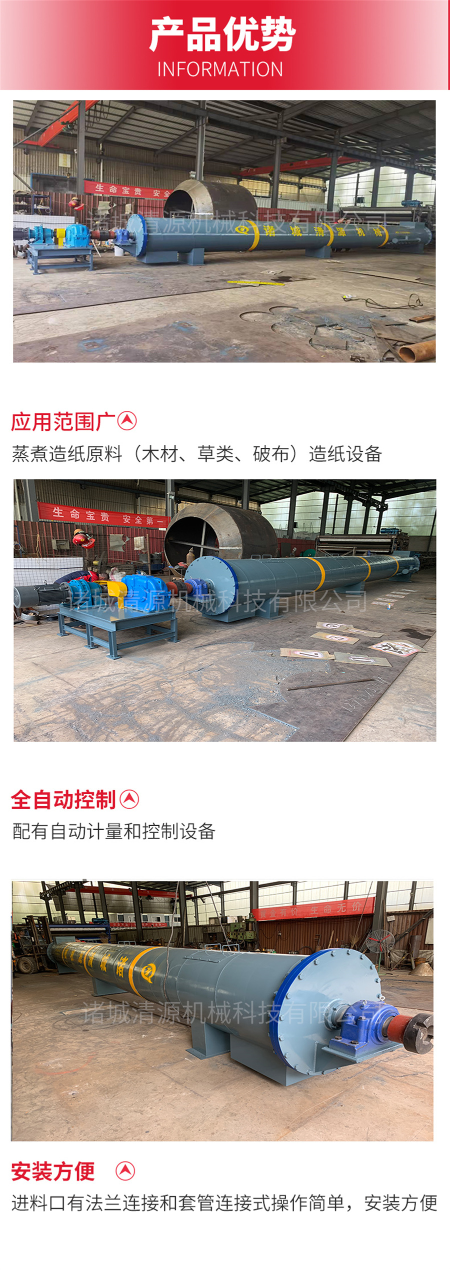 诸城清源机械科技有限公司生产的螺旋蒸煮器用以蒸煮造纸原料(如木材、草类、破布等),使与蒸煮液起化学作用而得到主要为纤维素的纸浆。